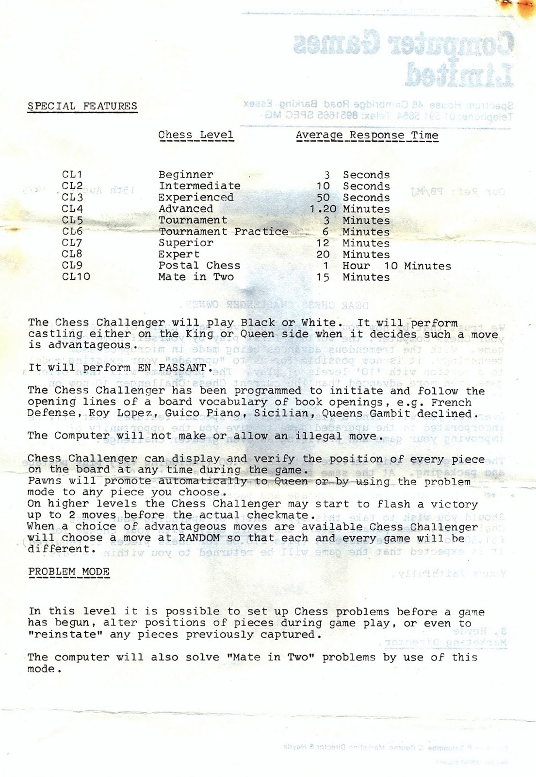 Según lo establecido en la carta, solo era necesario enviar la unidad principal (sin caja, manual ni accesorios) para la actualización. Por ese motivo, la caja, las figuras de ajedrez (sin imanes), el manual, carta de bienvenida al "grupo de élite" de propietarios del Chess Challenger (1977) y el transformador son los originales del CC1. A esta documentación inicial se une el resguardo de la garantía, con el nombre del propietario (Alderson) y la fecha de compra (24/12/77). Dos años más tarde, en 1979, el propietario recibió dos cartas de la empresa concesionaria: una ofertando la actualización por 50 libras (de 15 de agosto de 1979) (la propuesta de actualización también incluía la adquisición opcional de figuras imantadas por 10 libras) y otra ofreciendo un contrato de mantenimiento (sin repuesta). Con el ordenador actualizado, el propietario recibió el nuevo manual (UCC10). En la carta ofreciendo la actualización se incluía también información sobre los diez niveles.