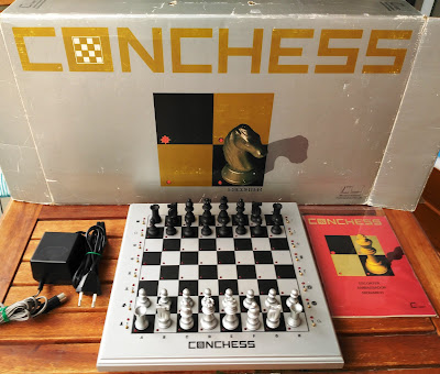Ordenador de ajedrez de diseño modular, desarrollado por la empresa alemana Consumenta Computer en 1981 y fabricado en Irlanda a partir de 1982 (previamente, de 1977 a 1981, Consumenta había distribuido en Alemania los Chess Challenger de la empresa norteamericana Fidelity). El sistema llegó a contar con dos tipos diferentes de módulos (con procesador y programa y módulos complementarios) y tableros de tres tamaños (Conchess Escorter de 30x30 cm, Conchess Ambassador de 38x38 cm y el Conchess Monarch de 52x52 cm). En 1982 salieron al mercado los primeros tableros de la serie, aunque solo tenían disponible el módulo estándar (tenía 24K de ROM en seis IC,s). La quiebra de la empresa paralizó el desarrollo de nuevos módulos hasta que LOPROC (la empresa alemana que había desarrollado el prototipo) continuó con la producción en 1983. La nueva propietaria rediseñó el módulo estándar (pasó a tener tres IC,s de ROM) y sacó al mercado un módulo con una biblioteca de aperturas. En 1984 su ordenador Conchess Princhess X compartió campeonato mundial (Glasgow) con Fidelity, Mephisto y Psion. La empresa sacó al mercado ese año nuevos módulos (versión Glasgow) y varios más en 1985 (versión Amsterdam). Este Conchess Escorter lo fabricó LOPROC en 1983 con el nuevo módulo (la ROM está en tres IC,s). Se ha recibido en su caja con la fuente de alimentación y el manual (en francés).